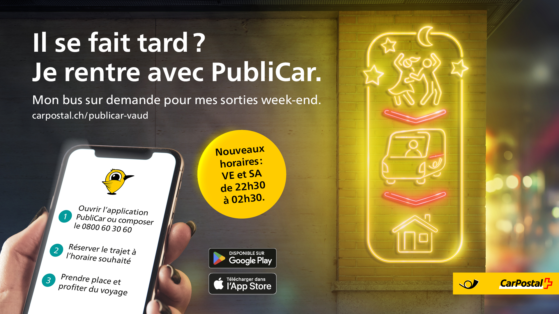 Est également à votre disposition PubliCar, bus sur appel flexible de Car Postal pour les sorties durant le week-end, que vous pouvez réserver simplement et facilement pour vos sorties durant le week-end via l’application PubliCar ou par téléphone au 0800 60 30 60 (appel gratuit), 7 jours/7, de 06h00 à 24h00. Vous indiquez les adresses de prise en charge et de destination ainsi que l’horaire souhaité.